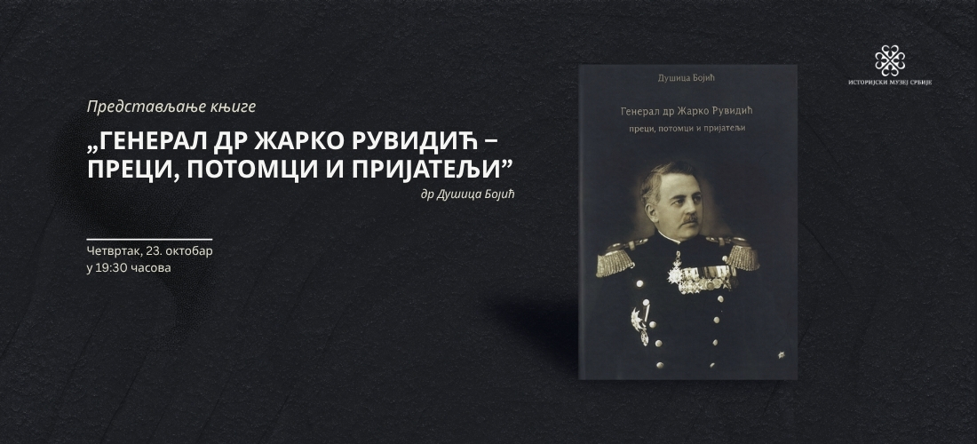 Историјски музеј Србије има задовољство да Вас позове да у четвртак 23. октобра у 19.30 часова присуствујете представљању књиге др Душице Бојић „Генерал др Жарко Рувидић – преци, потомци и пријатељи”, коју је Музеј недавно објавио.