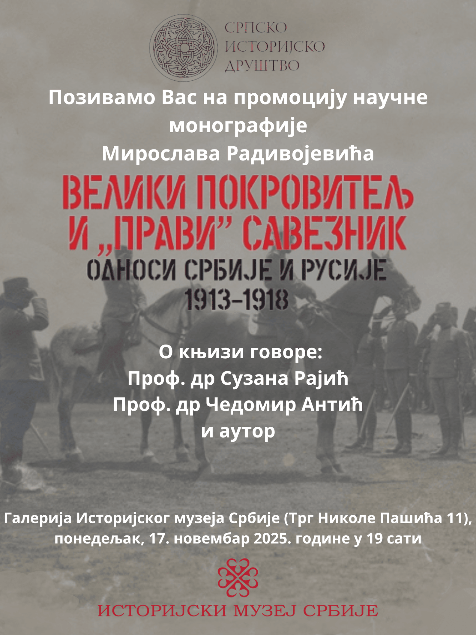 У понедељак, 17. новембра 2025. године, у 19 часова, у Галерији Историјског музеја Србије биће одржана промоција научне монографије Велики покровитељ и „прави” савезник. Односи Србије и Русије 1913–1918 др Мирослава Радивојевића, вишег научног сарадника Филозофског факултета Универзитета у Београду и члана Српског историјског друштва.