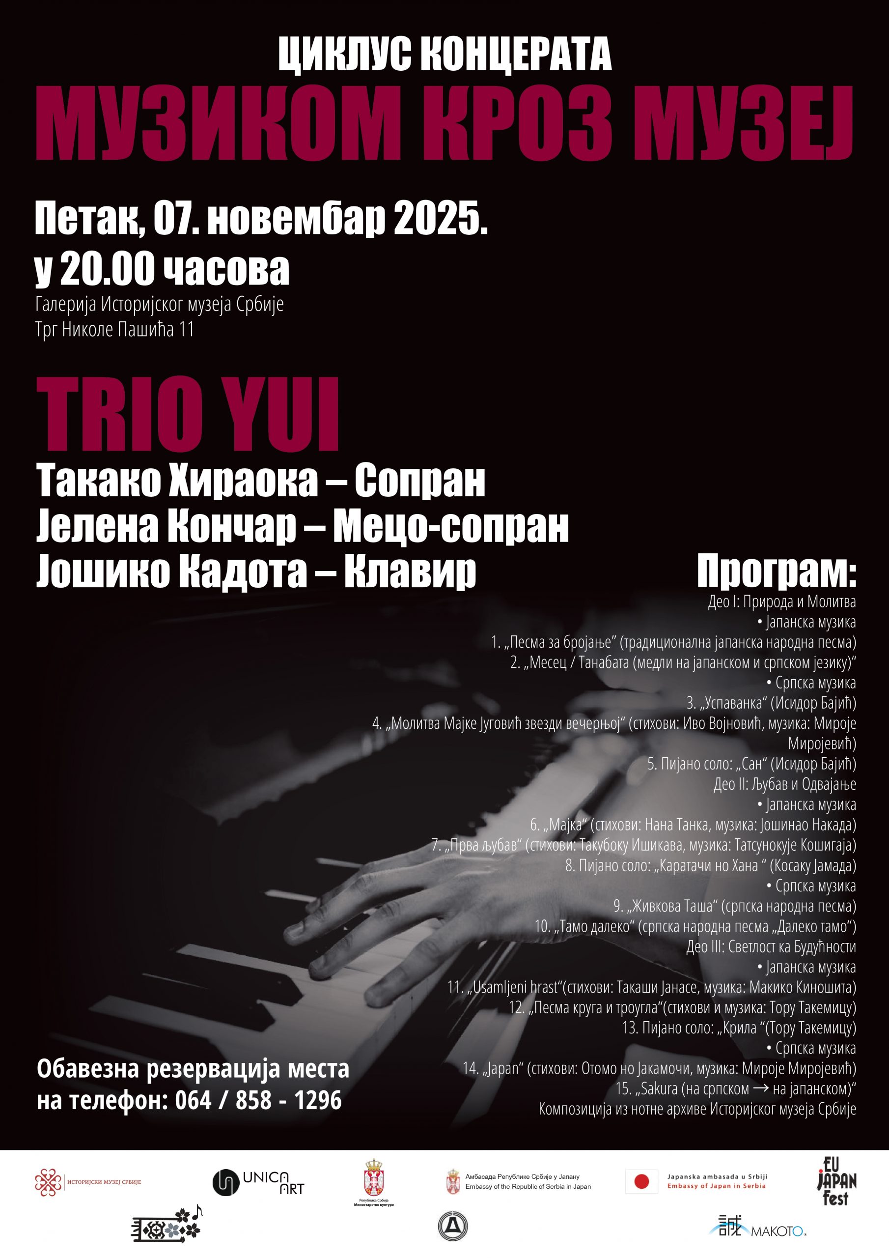 Историјски музеј Србије и удружење „UNICA ART” имају задовољство да Вас позову да у петак 7. новембра у 20 часова присуствујете концерту јапанског трија „YUI”, трећем концерту класичне и популарне музике у оквиру шесте сезоне циклуса „Музиком кроз музеј”.