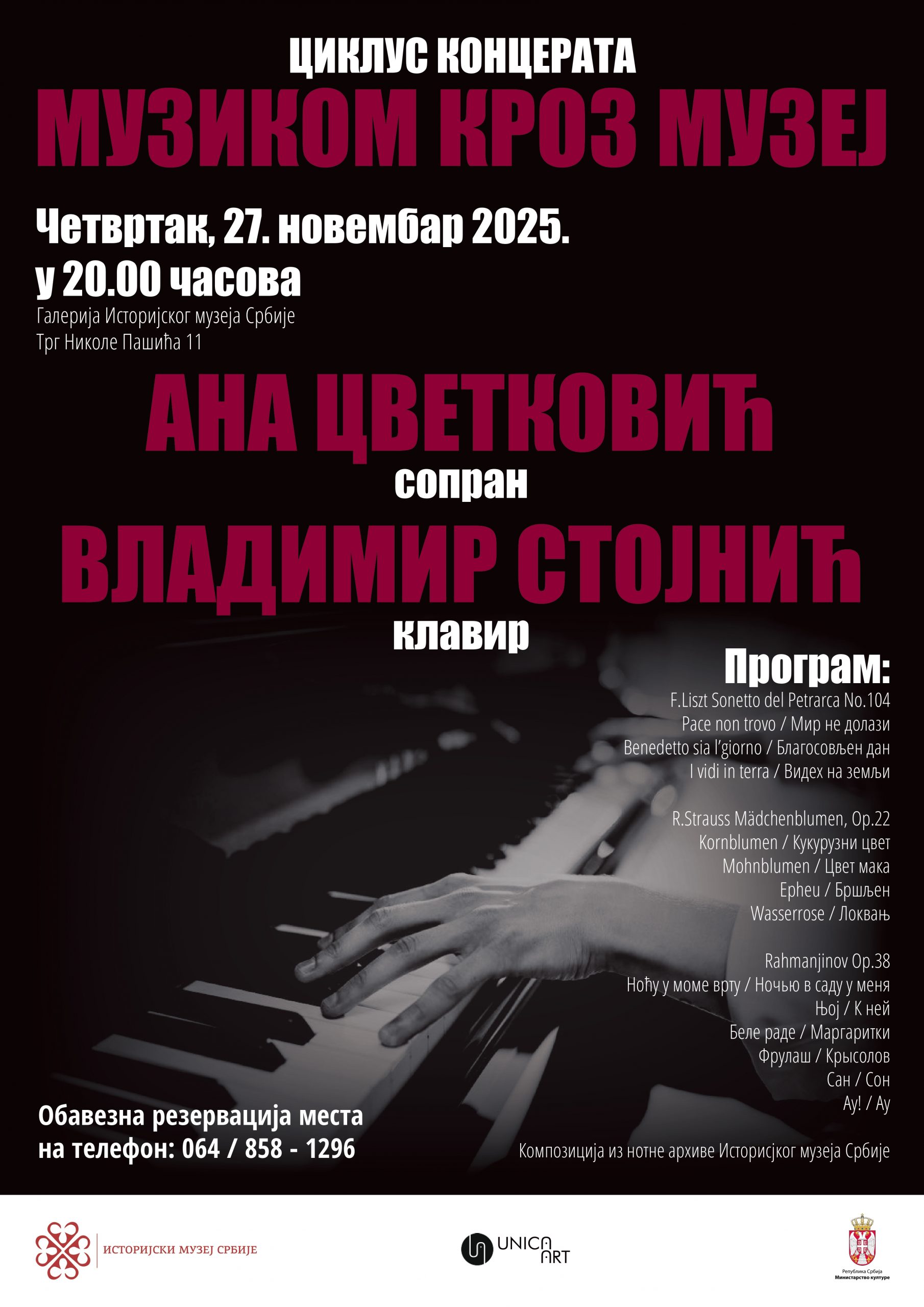 Историјски музеј Србије и удружење „UNICA ART” имају задовољство да Вас позову да у четвртак 27. новембра у 20 часова присуствујете концерту сопрана Ане Цветковић уз клавирску сарадњу Владимира Стојнића, петом концерту класичне и популарне музике у оквиру шесте сезоне циклуса „Музиком кроз музеј”. Концерт се одржава под покровитељством Министарства културе Републике Србије.