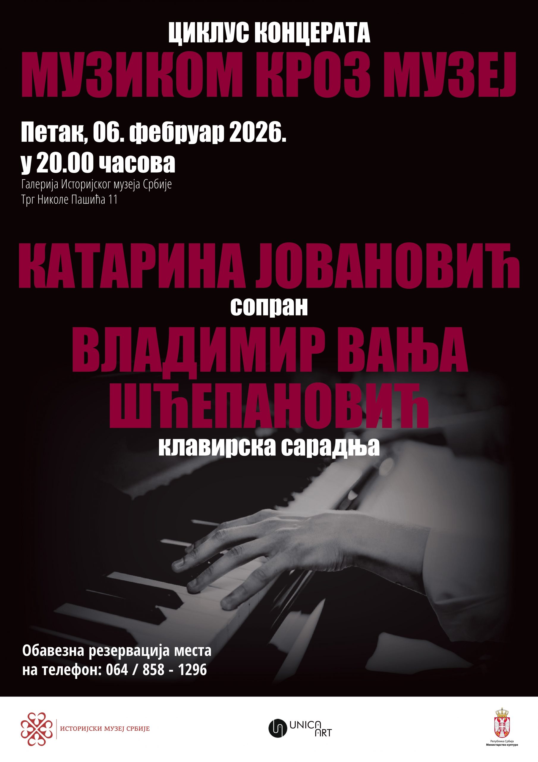 Историјски музеј Србије и удружење „UNICA ART” имају задовољство да Вас позову да у петак 6. фебруара у 20 часова присуствујете концерту сопрана Катарине Јовановић и пијанисте Владимира Вање Шћепановића, једанаестом концерту класичне и популарне музике у оквиру шесте сезоне циклуса „Музиком кроз музеј. Концерт се одржава под покровитељством Министарства културе Републике Србије.