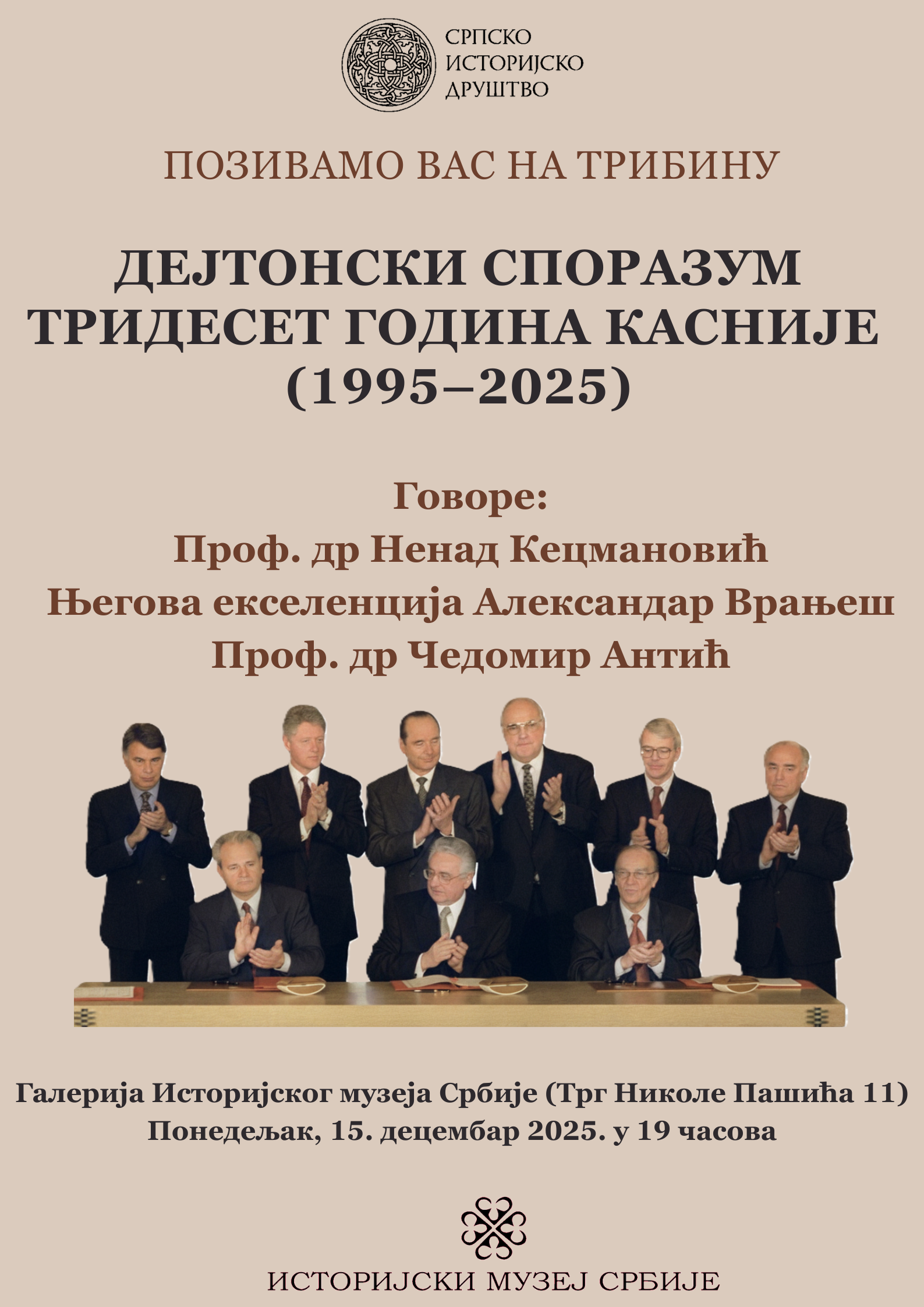 У понедељак, 15. децембра 2025. године, у 19 часова, у Галерији Историјског музеја Србије (Трг Николе Пашића 11), биће одржана трибина: „Дејтонски споразум – тридесет година касније (1995–2025)”.